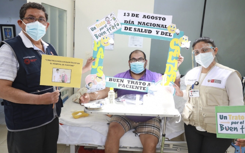 En el marco del “Día Nacional de la Salud y Buen Trato al Paciente", el Dr. Luis Manco Malpica, director del Hospital de Huaycán acompañado del Lic. Julio Ortega Ortega, jefe de la Unidad de Administración, la Dra. Judith Solis Bustamente, coordinadora de Telesalud , Lic. Hugo Casana , Asesor de Dirección y el personal del Área de Gestión de la Calidad del nosocomio, visitaron a los usuarios de consultorios externos como también a los pacientes hospitalizados para saludarlos y entregarles algunos presentes reafirmándoles su compromiso de continuar trabajando por la Salud y el buen trato, más aún en este época de pandemia.